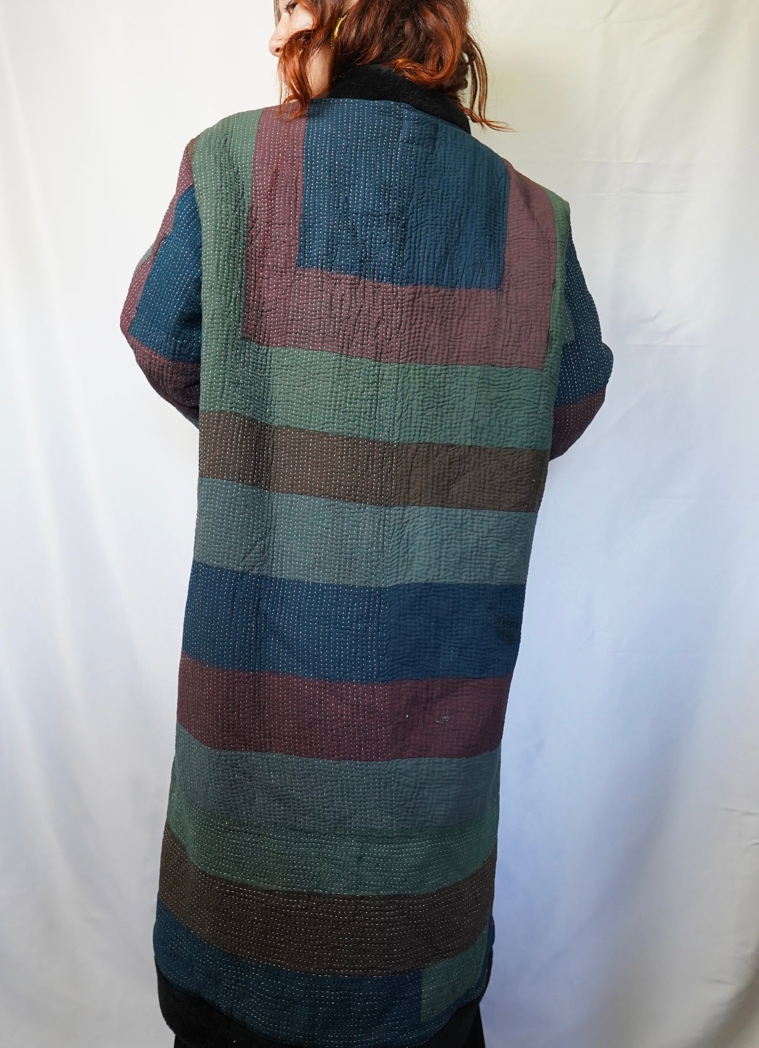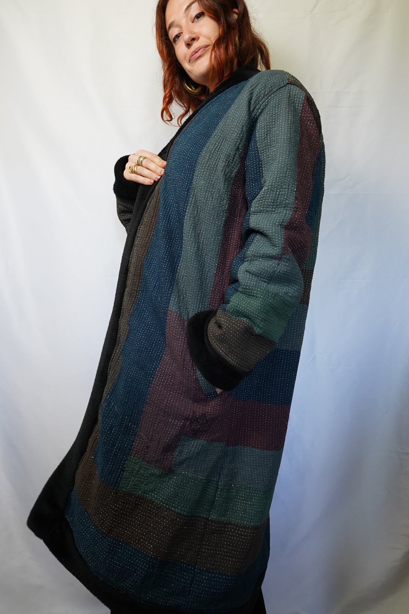 A floor-length statement piece blending heritage and luxury. With upcycled kantha blanket and lined with plush faux fur for ultimate warmth and elegance. Regal, opulent and irresistibly cozy.