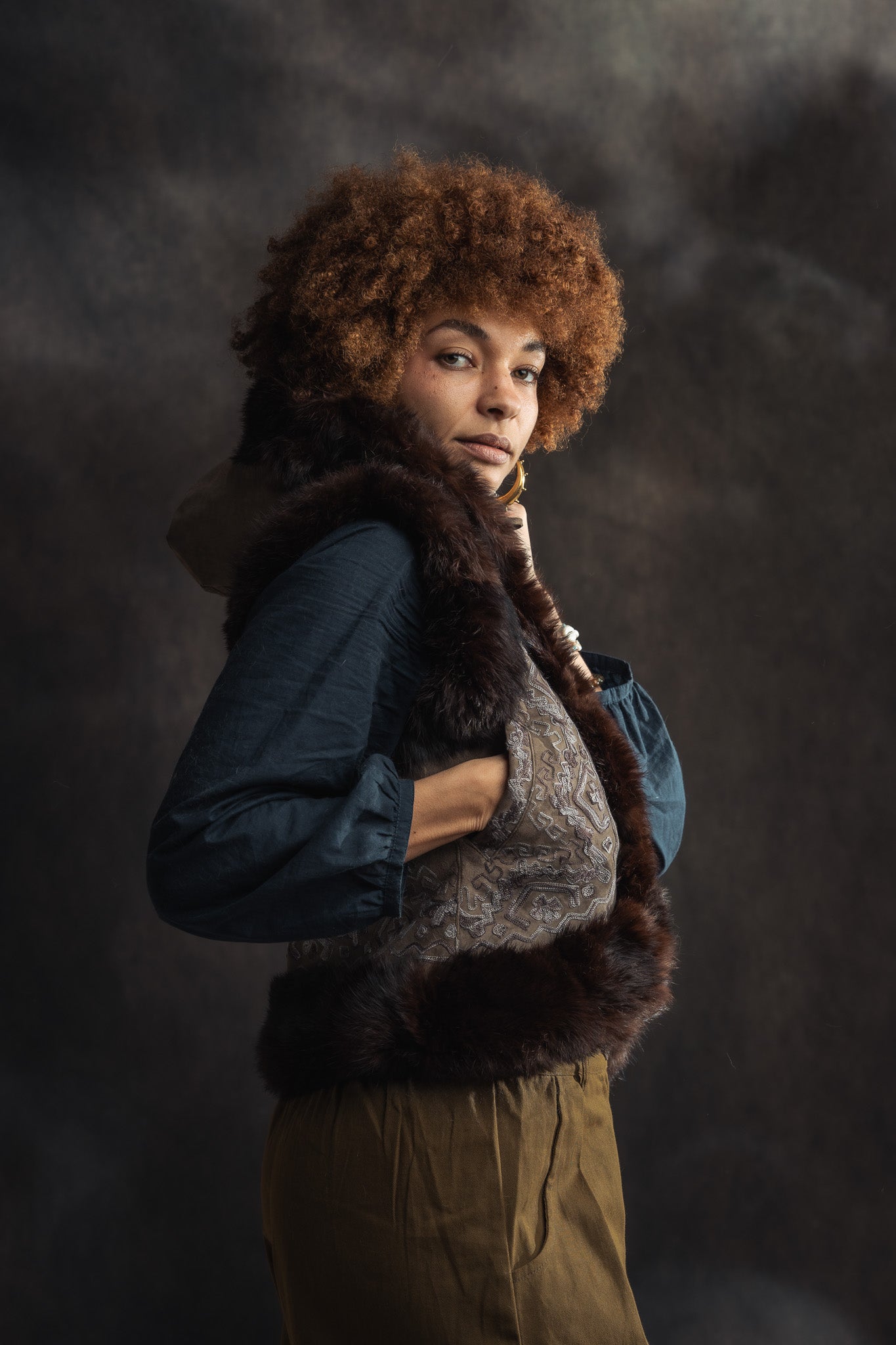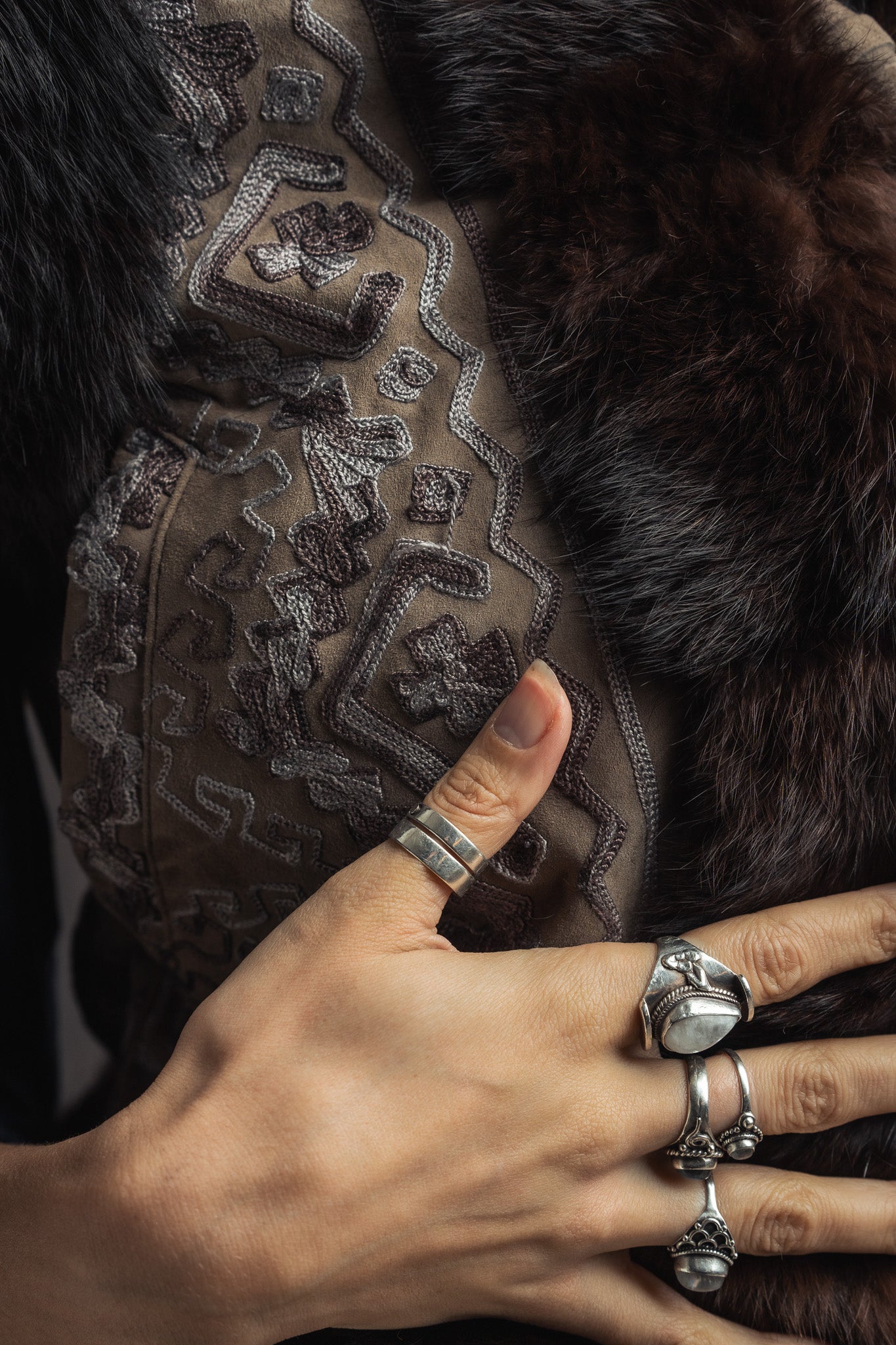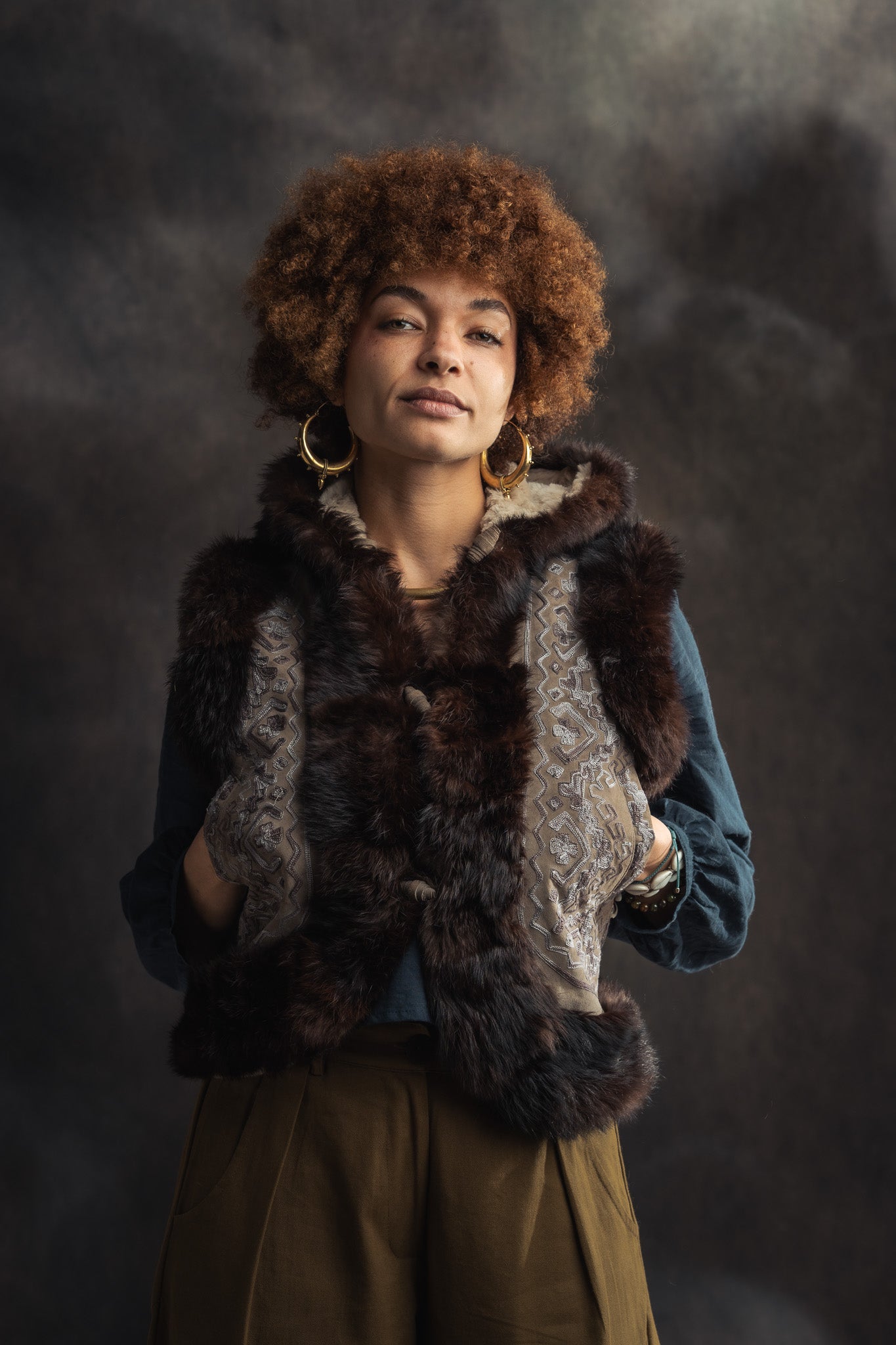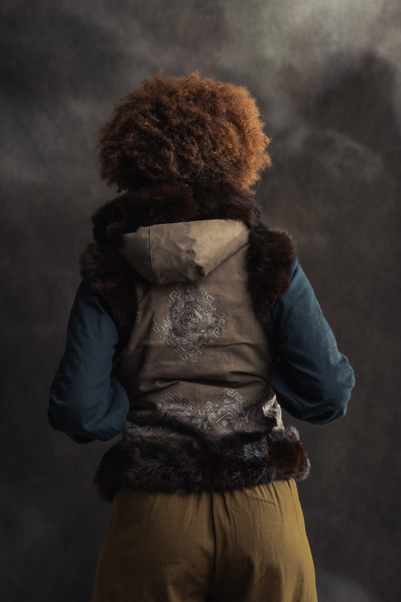 Kashmiri ethically sourced rabbit fur & suede Vest. Tribal and Rune inspired embroidery, emanate Kali energy. Rabbit fur lined, pockets, hood & 3 toggle ties for extra coziness.