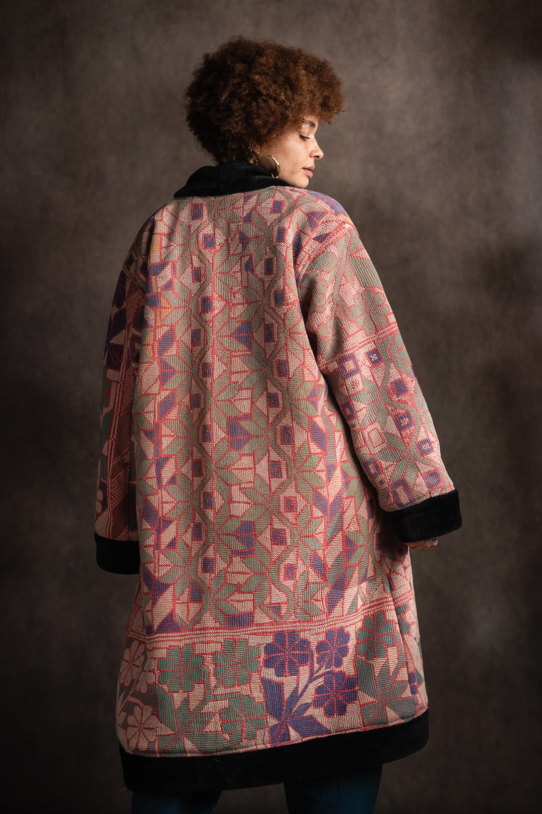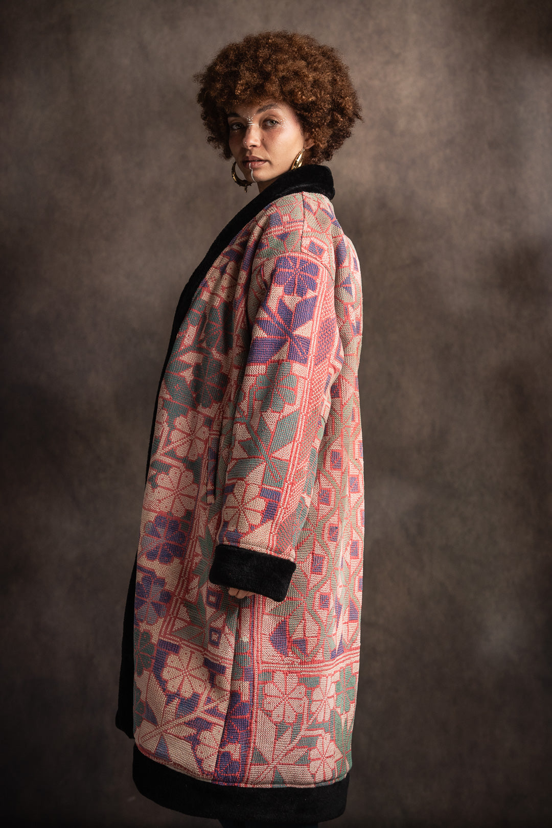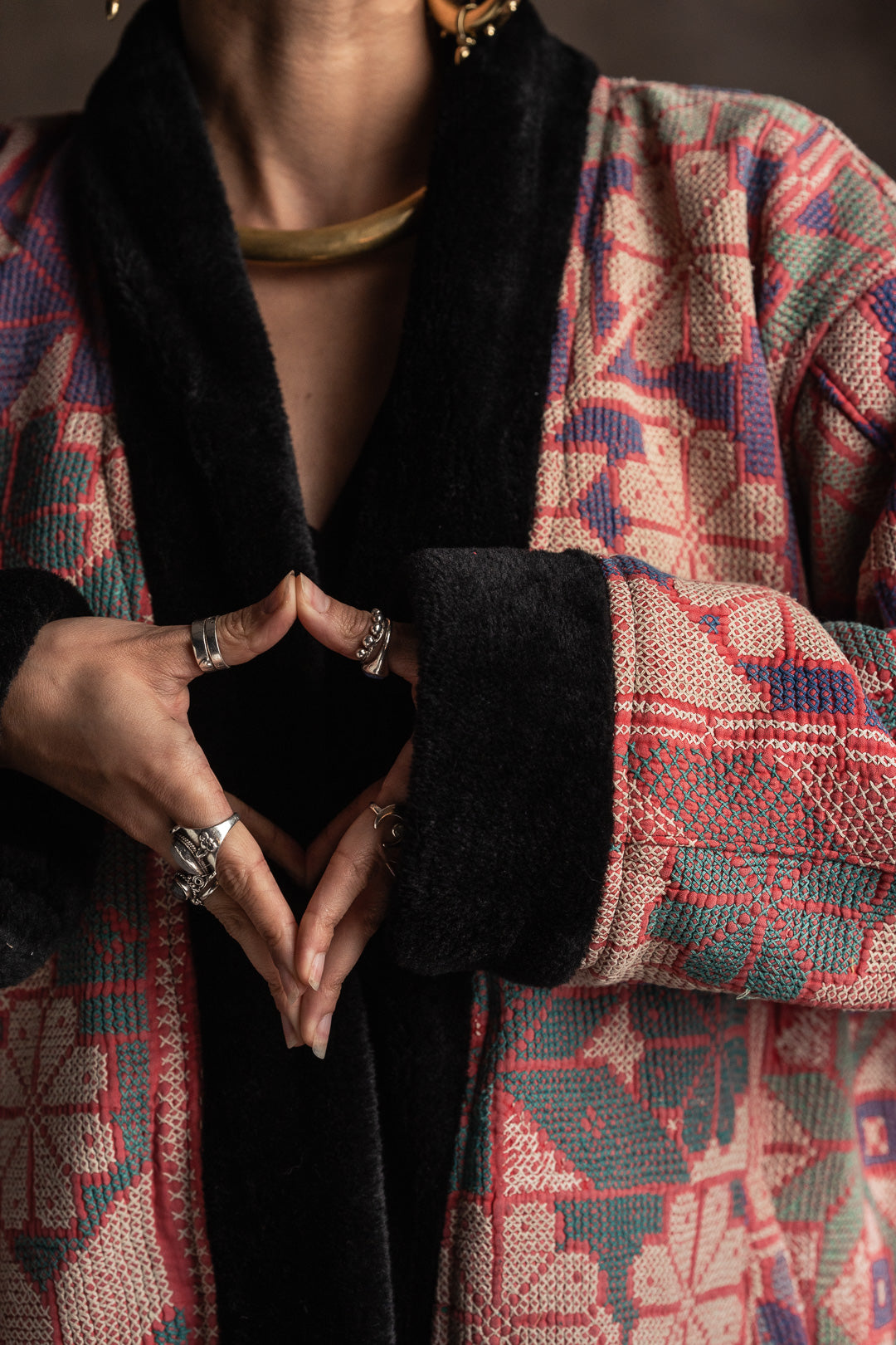 Rare hand woven Bangladeshi vintage Kantha with black faux fur lining. Regal as an Empress.