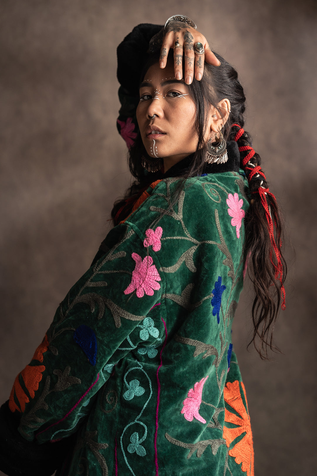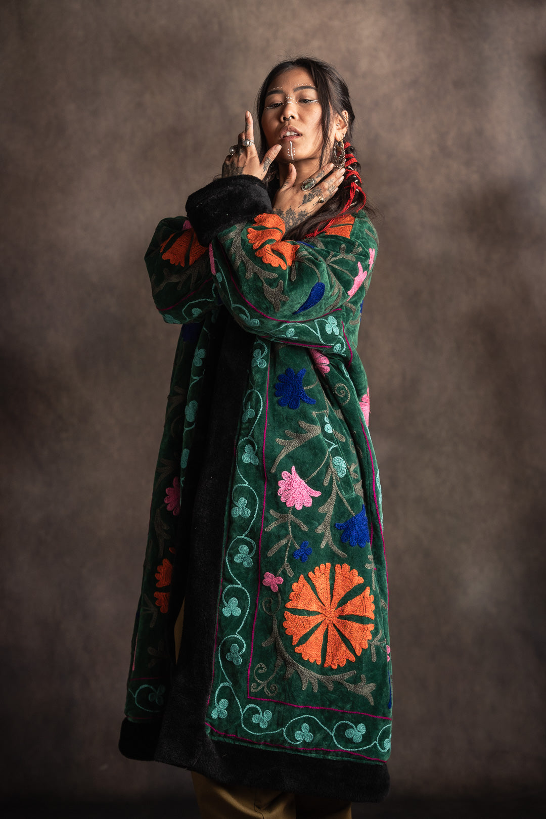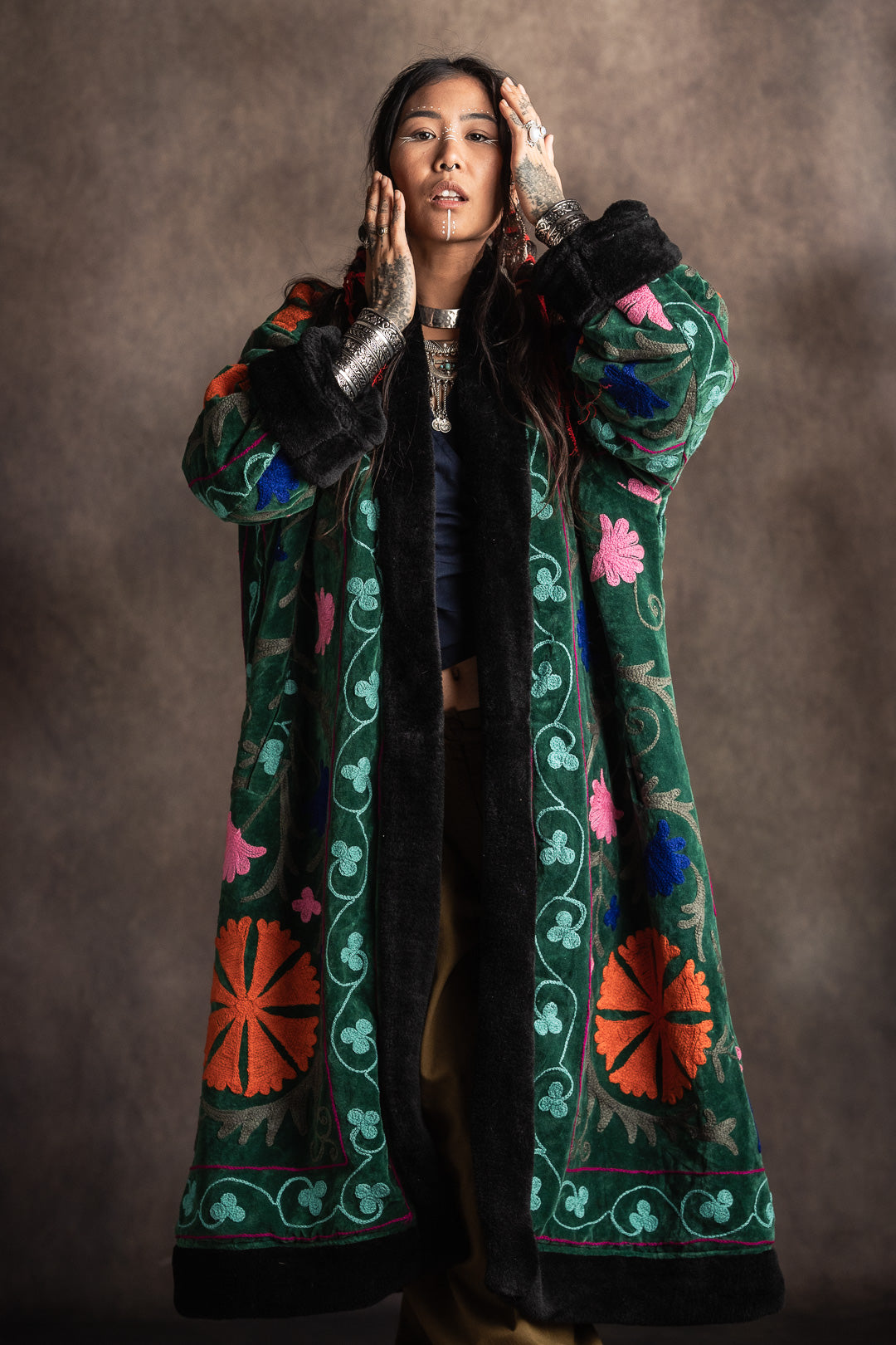 Opulent Suzani embroidery on plush velvet with a black faux fur lining, luxuriously cosy. Regal as an Empress.