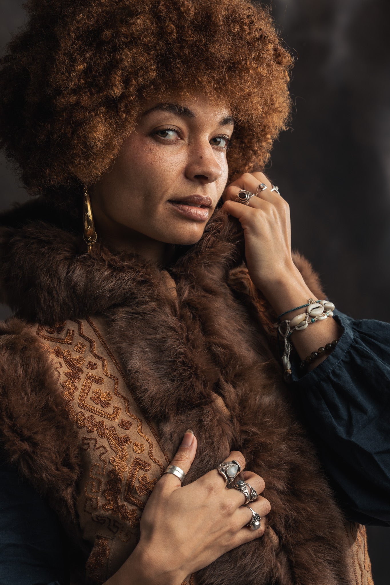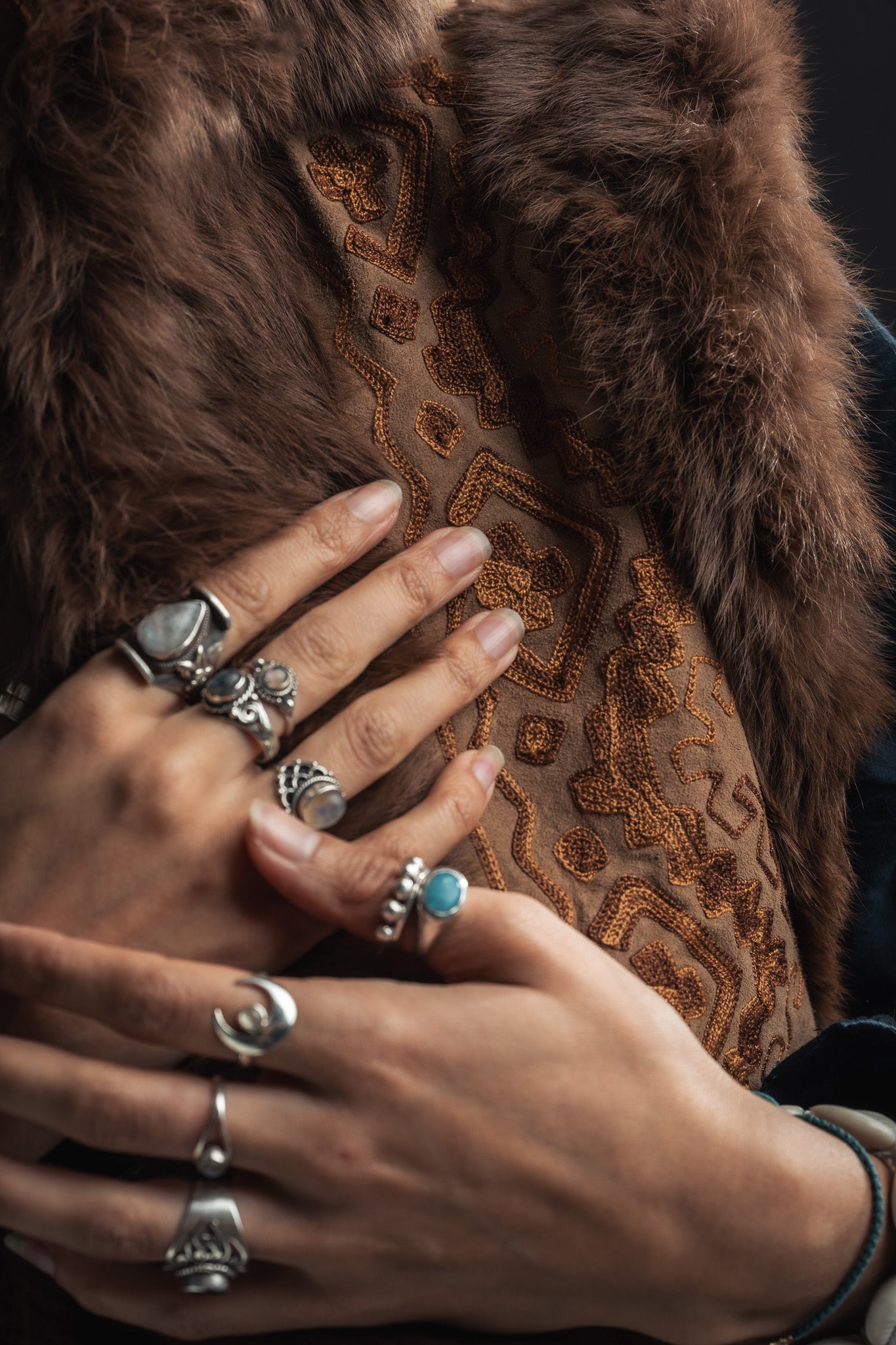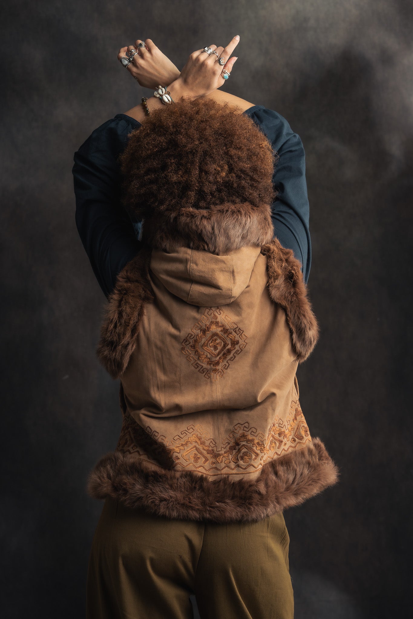 Kashmiri ethically sourced rabbit fur & suede Vest. Tribal and Rune inspired embroidery, emanate Kali energy. Rabbit fur lined, pockets, hood & 3 toggle ties for extra coziness.