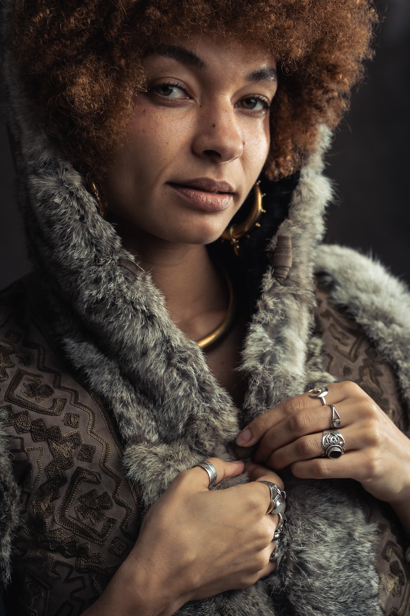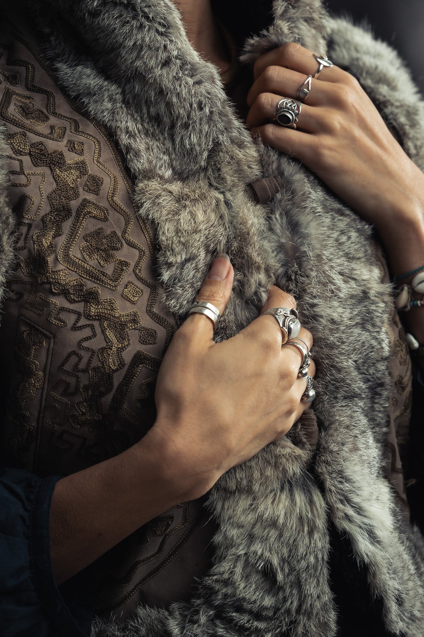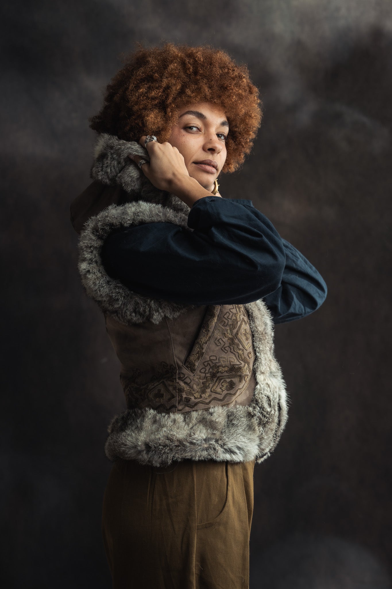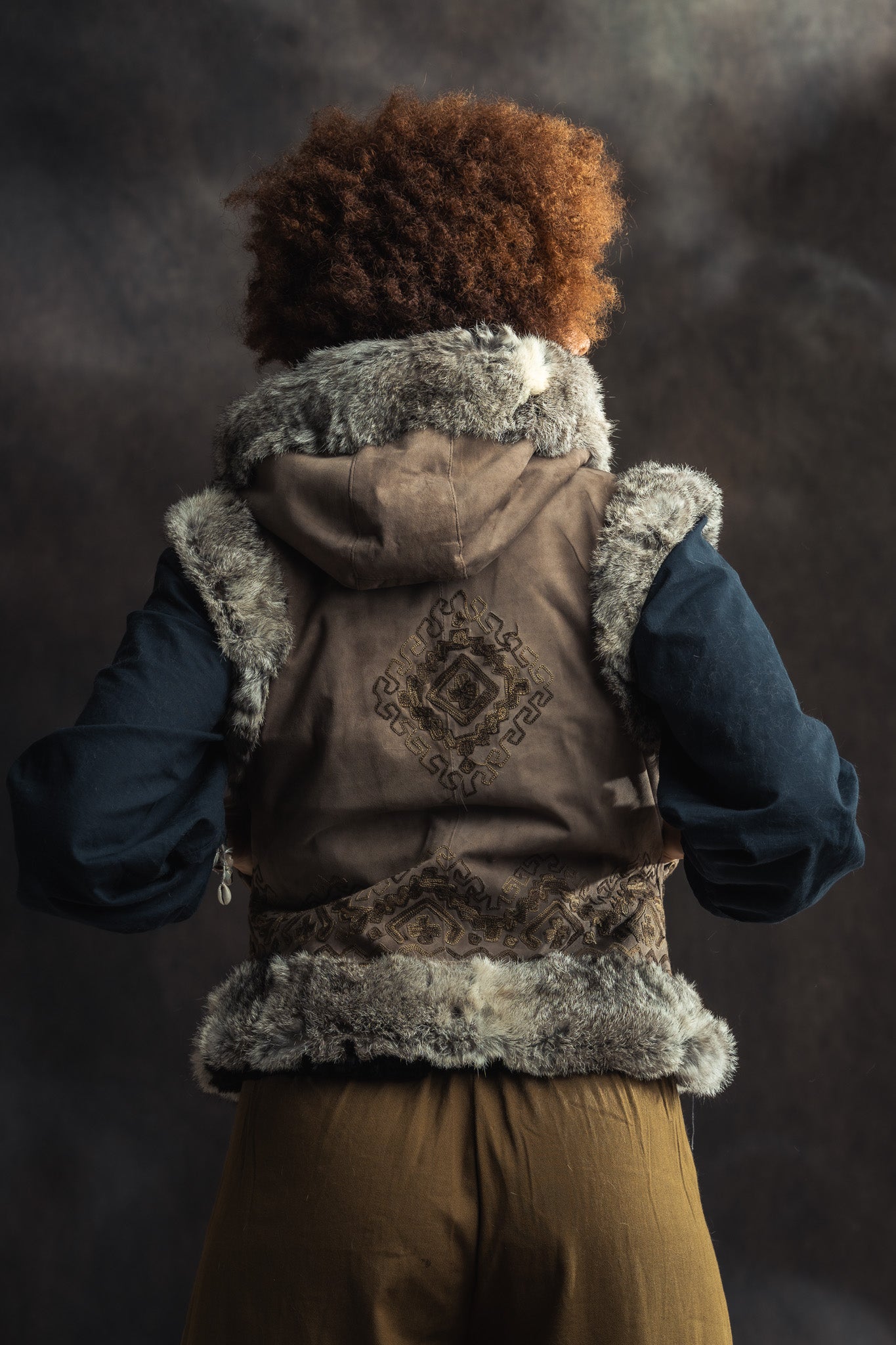 Kashmiri ethically sourced rabbit fur & suede Vest. Tribal and Rune inspired embroidery, emanate Kali energy. Rabbit fur lined, pockets, hood & 3 toggle ties for extra coziness.